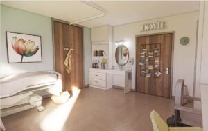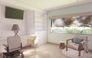For residents, families, and staff, the new facility also will be a beautiful, inviting place to live, visit, and spend time. All rooms will be designed to feature scenic outdoor views, abundant natural light, and a comfortable environment. In addition to eliminating the need to navigate elevators and stairs, the new facility will enhance quality of life with larger resident rooms, increasing from 164 gross square feet (GSF) in the current facility to 250 GSF.